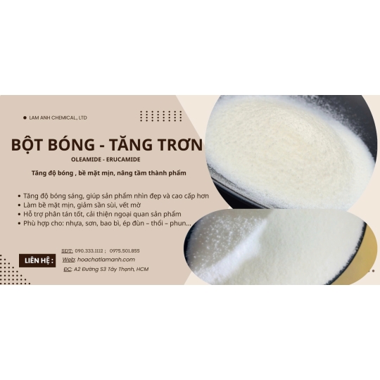 Mô tả sản phẩm : tăng bóng Oleamide là phụ gia chuyên dụng giúp cải thiện độ bóng, độ trong suốt và tăng khả năng trượt cho các sản phẩm từ PE, PP. Với thành phần chính là hợp chất oleamide – một dẫn xuất của acid stearic – phụ gia này không chỉ đóng vai trò như chất bôi trơn mà còn là cầu nối liên kết giữa các mạch polymer, giúp bề mặt sản phẩm mịn màng và sáng bóng vượt trội.